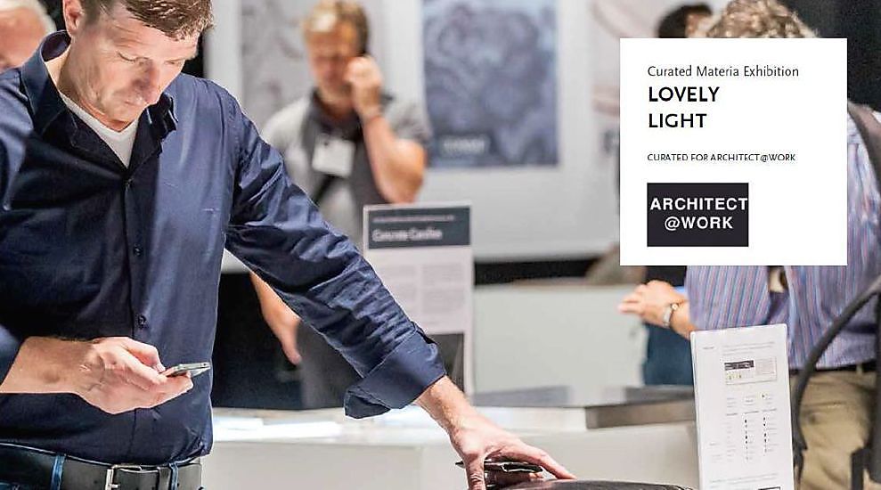 ARCHITECT@WORK koos dit jaar voor het thema 'Architectuur & Licht'. In dat kader stelde Materia exclusief voor ARCHITECT@WORK een nieuwe tentoonstelling “Lovely Light” samen. We hebben licht nodig om te kunnen leven, voor zuurstof, voor energie en voor onze gezondheid. Met licht kunnen we de hele nacht door feesten, kunnen we kleuren zien en we worden er vrolijk van. Daglicht stimuleert namelijk het lichaam om serotine aan te maken, wat grote invloed heeft op onze stemming, geheugen, eetlust, zelfvertrouwen, emotie en zelfs de verwerking van pijnprikkels. Maar wat kan materiaal allemaal met licht? De Materia-tentoonstelling toont de bezoeker met materiaalsamples, inspirerende projecten en bijzondere objecten het belang en de mogelijkheden van licht in architectuur. Een ontdekkingstocht langs 125 bijzondere materialen die allemaal een relatie met licht hebben, onderverdeeld naar de categorieën lichtdoorlatendheid, lichtreflectie, UV-reagerend, lichtabsorptie en lichtproductie. Materialen die extra daglicht de ruimte in brengen of juist licht absorberen. Of doorschijnend hout en beton, superblack coatings die 98% licht absorberen, iridiserende coatings, energie-opwekkende folies en materialen die interactief translucent zijn. De mooiste Glow-in-the-darks, textiel met LED en automatisch zonwerend glas. Functioneel of esthetisch. Kortom: de Materiatentoonstelling “Lovely Light” toont de mooiste en nieuwste materialen en projecten rondom het thema licht.