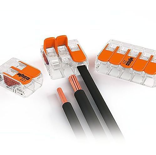 Met de ‘COMPACT’ klem van serie 221 kan de elektro-installateur een snelle, eenvoudige en veilige installatie maken. Dat kan zowel met fijn- en meeraderige als massieve geleiders. Met een toelaatbare nominale stroom van 32A en een nominale spanning van 450V is de serie 221 geschikt voor de inzet in 230V en 400V netwerken. De transparante behuizing biedt de mogelijkheid om niet ver genoeg ingestoken of niet correct ontmanteld geleiders duidelijk te herkennen. Twee goed toegankelijke testopeningen maken het meten zelfs na de installatie eenvoudig. De serie bestaat uit een 2-, 3- en 5-polige versie (221-412, 221-413, 221-415). Voor fijnaderige geleider is het aansluitbereik 0,14 tot 4mm² en voor massieve of meeraderige geleiders van 0,2 tot 4 mm².