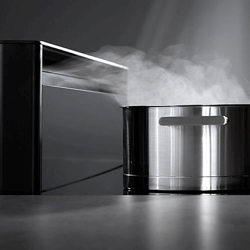 Novy breidt zijn assortiment werkbladdampkappen uit met Panorama. Bij deze kookplaat en dampkap in één zit de ventilatietoren handig en stijlvol achteraan het werkblad. Deze kan op 10, 20 of 30 cm gepositioneerd worden. De dampen worden zo onmiddellijk afgezogen aan de bron, afhankelijk van de hoogte van de kookpotten. Dit zorgt niet alleen voor een efficiënte afzuiging, tegelijk heb je zo meer bergruimte in de onderkast en heb je meer bewegingsvrijheid tijdens het koken. Er werd gekozen voor een strakke, zwarte ventilatietoren, opgetrokken in semitransparant glas met lichte doorkijk.