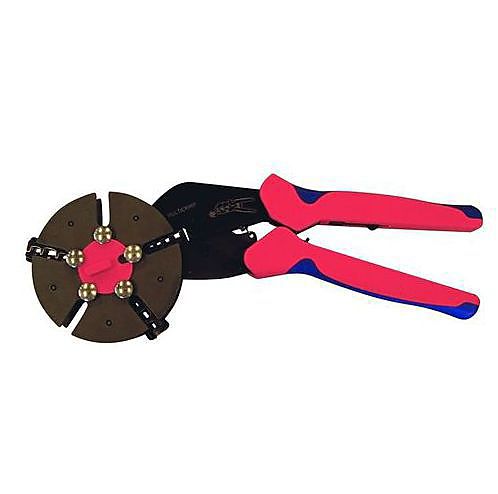 De multifunctionele sperkrimptang van Klemko (RS-MULTICRIMP3V, art.nr.: 900205) is geschikt voor het verwerken van on- en geïsoleerde kabelschoenen en adereindhulzen. Deze veelzijdige tang heeft een magazijn, voorzien van een riemclip, met daarin 3 soorten matrijzen. De installateur of monteur kan met deze tang de rood, blauw en geel geïsoleerde kabelschoenen, de ongeïsoleerde F-krimp kabelschoenen en adereindhulzen verwerken van 0,5 tot en met 6 mm². Deze mechanische tang heeft een eindevergrendeling en is voorzien van een automatische terugloop. De verwisselbare matrijzen zijn zonder gereedschap klik-en-klaar in de tang te plaatsen.