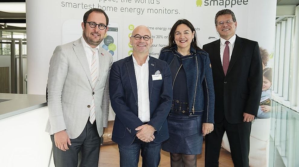 Op 25 september bezochten Maroš Šefcovic, vicevoorzitter van de Europese Commissie belast met energie-unie, en federaal minister van Energie en Leefmilieu Marie-Christine Marghem de Eurometropool -Doornik, Kortrijk, Rijsel- in het kader van innovatie voor consumenten op het gebied van energie en milieu. Daarbij gingen ze ook langs bij het Kortrijks cleantechbedrijf Smappee, dat slimme energiemonitors met bijhorende app maakt om gezinnen duurzaam te laten omgaan met hun energie. De bezoekers kregen een rondleiding en uitleg over de werking van Smappee. Daarnaast lichtte het bedrijf ook de plannen van zijn CEO Stefan Grosjean toe om een incubator voor innovatieve energiestart-ups te bouwen in Kortrijk. “Het bezoek van de minister en de vicevoorzitter zijn voor ons een grote eer”, aldus CEO Stefan Grosjean. “Bovendien komt het op een belangrijk moment: we vieren dit jaar onze vijfde verjaardag. In die periode lanceerden we vijf producten voor consumenten en bedrijven, bouwden we verkoopkanalen uit in 85 landen en groeiden we van een start-up naar een bedrijf met een 40-tal medewerkers. Sinds kort is er ook een team actief op de Amerikaanse markt.” Het gaat dus hard voor het jonge bedrijf. “Maar we willen meer”, zegt Grosjean. “Smappee moet een echte thuis en nog meer groeimogelijkheden krijgen. Daarom start ik dit jaar nog met de constructie van een nieuw gebouw met een testlab. Ook innovatieve, veelbelovende start-ups zullen er de ruimte krijgen om te groeien. Zij kunnen leren van de ervaren experts bij Smappee, gebruik maken van onze faciliteiten en synergieën uitwerken. Als mentor help ik hen ook graag verder groeien. We willen het kloppend hart worden van een echte energy hub.”