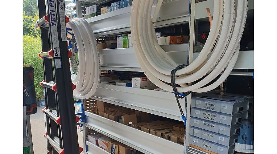 Voor de inrichting van het voertuig kwam eerst een vertegenwoordiger van Sortimo ter plaatse om een 3D-tekening te maken. Op die manier konden alle afmetingen precies worden ingeschat. Daarna bestelde Steven alle materialen bij Sortimo en ging hij er zelf mee aan de slag. Vooraleer hij de op maat gemaakte Globelyst-platen plaatste, isoleerde hij de wanden. Daarnaast ontwikkelde hij zelf houdertjes – ideaal voor het opbergen van batterijen – om op de gaatjes van de Globelyst alu-wand te schroeven.