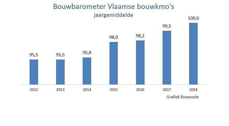 De bouwbarometer die Bouwunie elk kwartaal publiceert is in het vierde kwartaal gestegen tot 100,8 indexpunten. Op die manier klokt het jaargemiddelde van 2018 af op 100,6 indexpunten, wat duidelijk beter is dan het gemiddelde van de vorige jaren.
