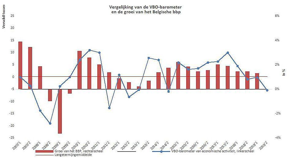 Twee keer per jaar bevraagt het Verbond van Belgische Ondernemingen (VBO) zijn sectorfederaties om een balans te maken van de economische situatie en van de vooruitzichten voor het komende halfjaar. De resultaten van het gevoerde onderzoek zijn eerder ongunstig: de economische activiteit is er in het voorbije jaar op achteruit gegaan en de vooruitkijkende conjunctuurbarometer staat op het laagste peil sinds de schuldencrisis van 2011-2012.